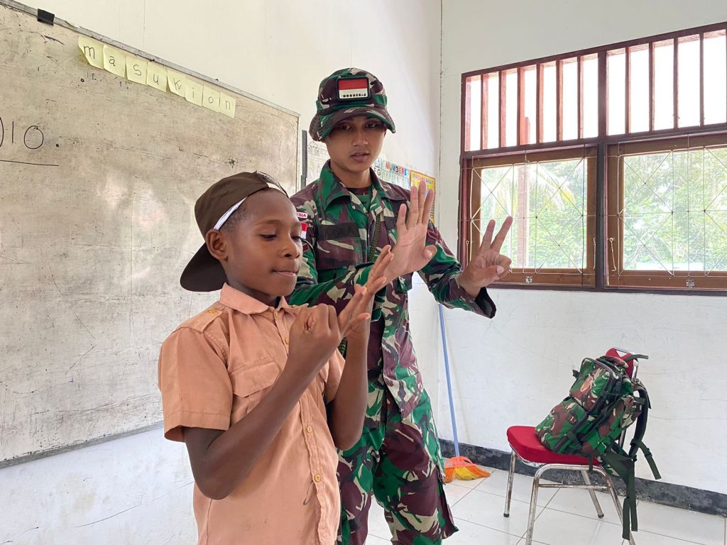 Serda Saleh Kurniawan salah seorang personel Satgas memberikan contoh jari sebagai alat bantu menghitung. Sambil tersenyum dan gembira adek tersebut menirukan dengan semangat dan antusias materi berhitung yang diberikan oleh kakak-kakak TNI.