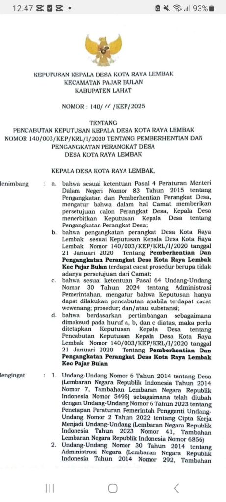 Batasnews.id-Lahat Sumatra Selatan – kepala Desa kota raya Lembak secara serta merta mengeluarkan Surat Keputusan Kepala Desa kota raya Lembak Kecamatan Pajarbulan Kabupaten lahat Nomor : 140 /11/2025