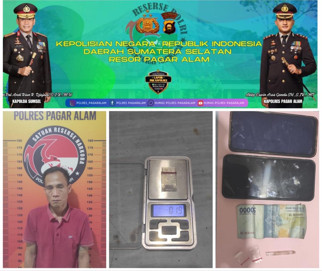 Batasnews.id – Pagaralam – Sat Resnarkoba Polres Pagar Alam berhasil mengungkap kasus tindak pidana narkotika jenis sabu pada hari Rabu, 14 Mei 2025, sekitar pukul 15.30 WIB. Penangkapan dilakukan di Jl. Nusa Indah, Kelurahan Tebat Giri Indah, Kecamatan Pagar Alam Selatan, Kota Pagar Alam. Pelaku berinisial RL (44), seorang wiraswasta, ditangkap beserta sejumlah barang bukti berupa sabu, alat hisap, dompet, dua unit handphone, dan uang tunai.