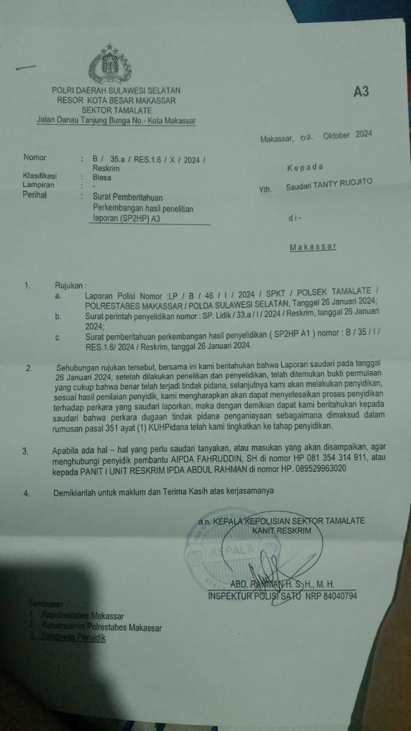 Kasus dugaan penganiayaan yang dialami Tanty Rudjito bersama kedua orang tuanya hingga kini belum menunjukkan perkembangan yang berarti. Laporan tersebut telah dilayangkan ke Polsek Tamalate pada Jumat, 26 Januari 2024. Tanti memperlihatkan bukti laporan yang ke awak media berupa :
