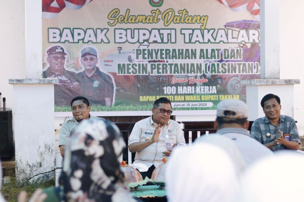 Dan dalam rangka 100 masa kerja Bupati dan Wakil Bupati Takalar, Daeng Manye didampingi Tanaman Pangan, Holtikultura Perkebunan dan Ketahanan Pangan Kab. Takalar, Camat Pattallassang dan Lurah Bajeng menyerahkan alat dan mesin pertanian (Alsintan) secara simbolis kepada kelompok tani di Kab. Takalar, Jum’at (13/6/2025) di Kelurahan Bajeng Kecamatan Pattallassang Kab. Takalar.