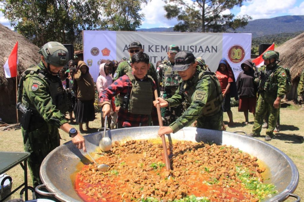 Prajurit TNI dan warga Kuyawage bahu-membahu memasak dan menikmati hidangan bersama dalam suasana penuh kekeluargaan.