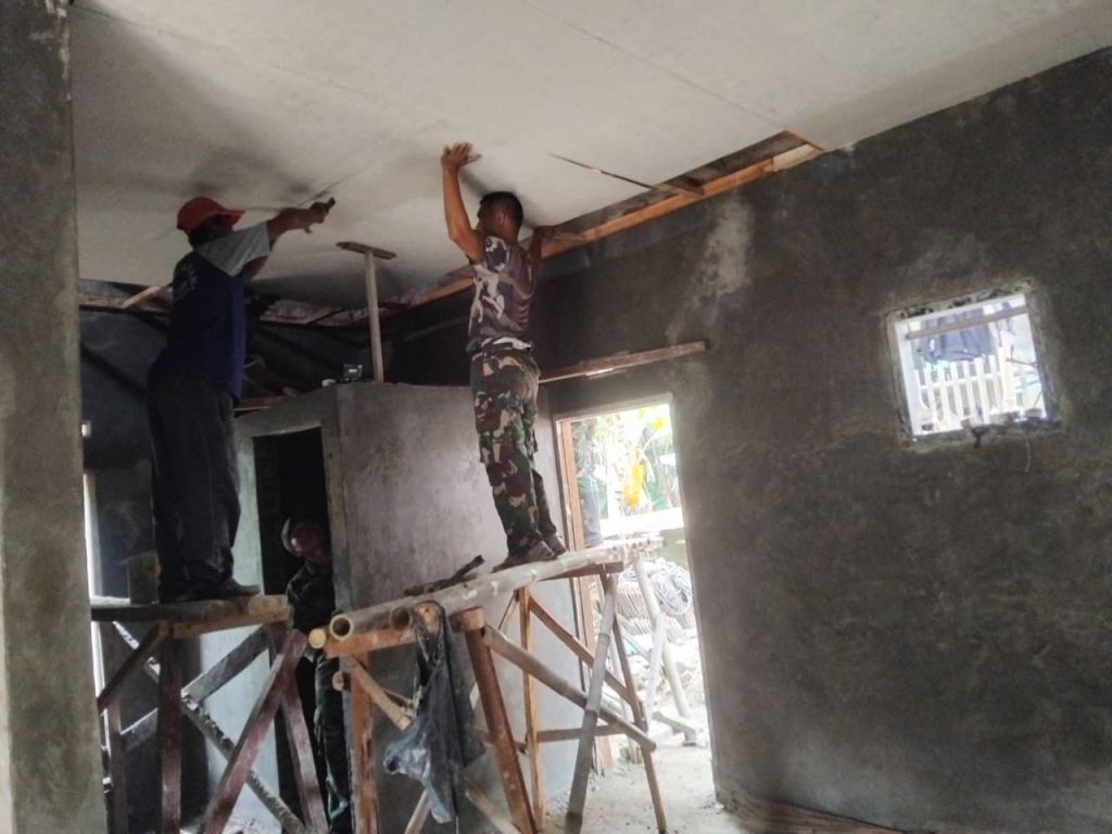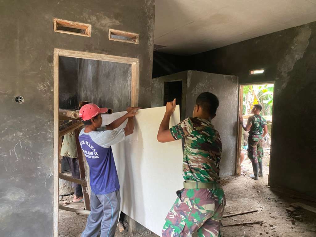 Terlihat dalam kegiatan tersebut, para anggota Satgas TMMD bersama warga bahu-membahu mengangkat dan memasang lembaran plafon di bagian dalam rumah yang sedang direhab. Proses pemasangan dilakukan dengan penuh ketelitian untuk memastikan hasil pekerjaan rapi, kuat, dan nyaman bagi penghuni rumah nantinya.