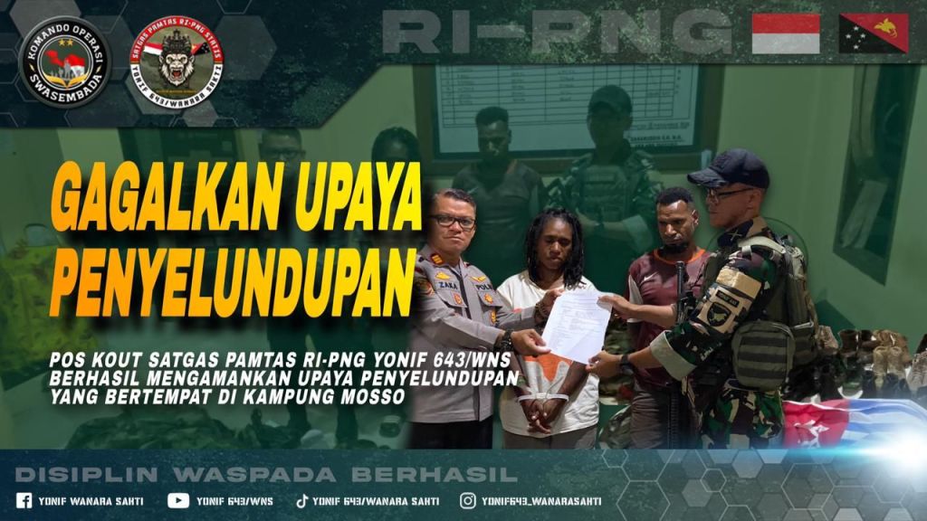 Batasnews.id[ MOSSO, JAYAPURA ] – Personil Satgas Pamtas RI-PNG Statis Yonif 643/Wns berhasil menggagalkan upaya penyelundupan dan mengamankan 2 (dua) pelaku beserta sejumlah barang bawaan.