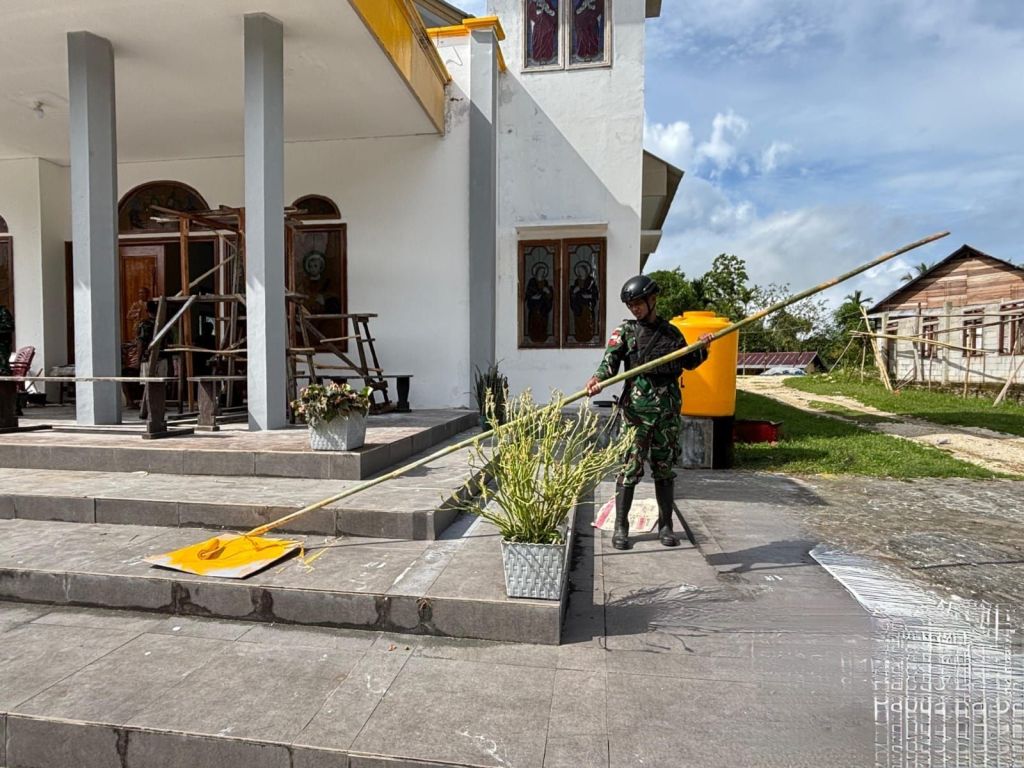Batasnews.id[ KRAMAMONGGA ] — Dalam rangka menyambut Hari Raya Natal Tahun 2025, Pos Kramamongga Satgas Yonif 410/Alugoro melaksanakan kegiatan karya bhakti pembersihan dan pengecatan gereja bersama masyarakat Kampung Kramamongga, Papua Barat. (20/12/2025).