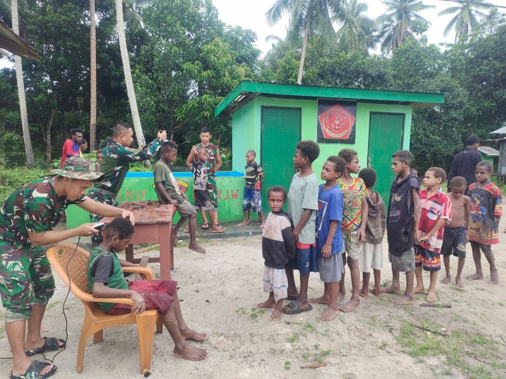 Dengan penuh kesabaran dan keakraban, personel TNI melayani satu per satu anak-anak, menciptakan suasana yang akrab layaknya keluarga.